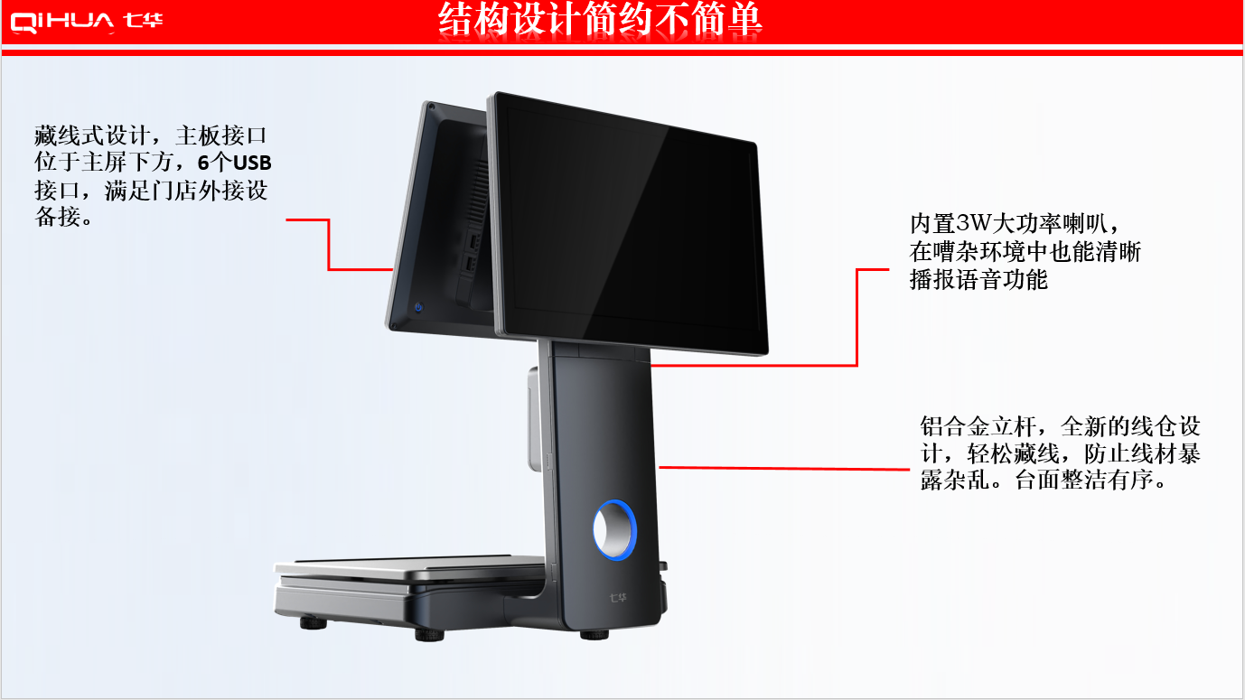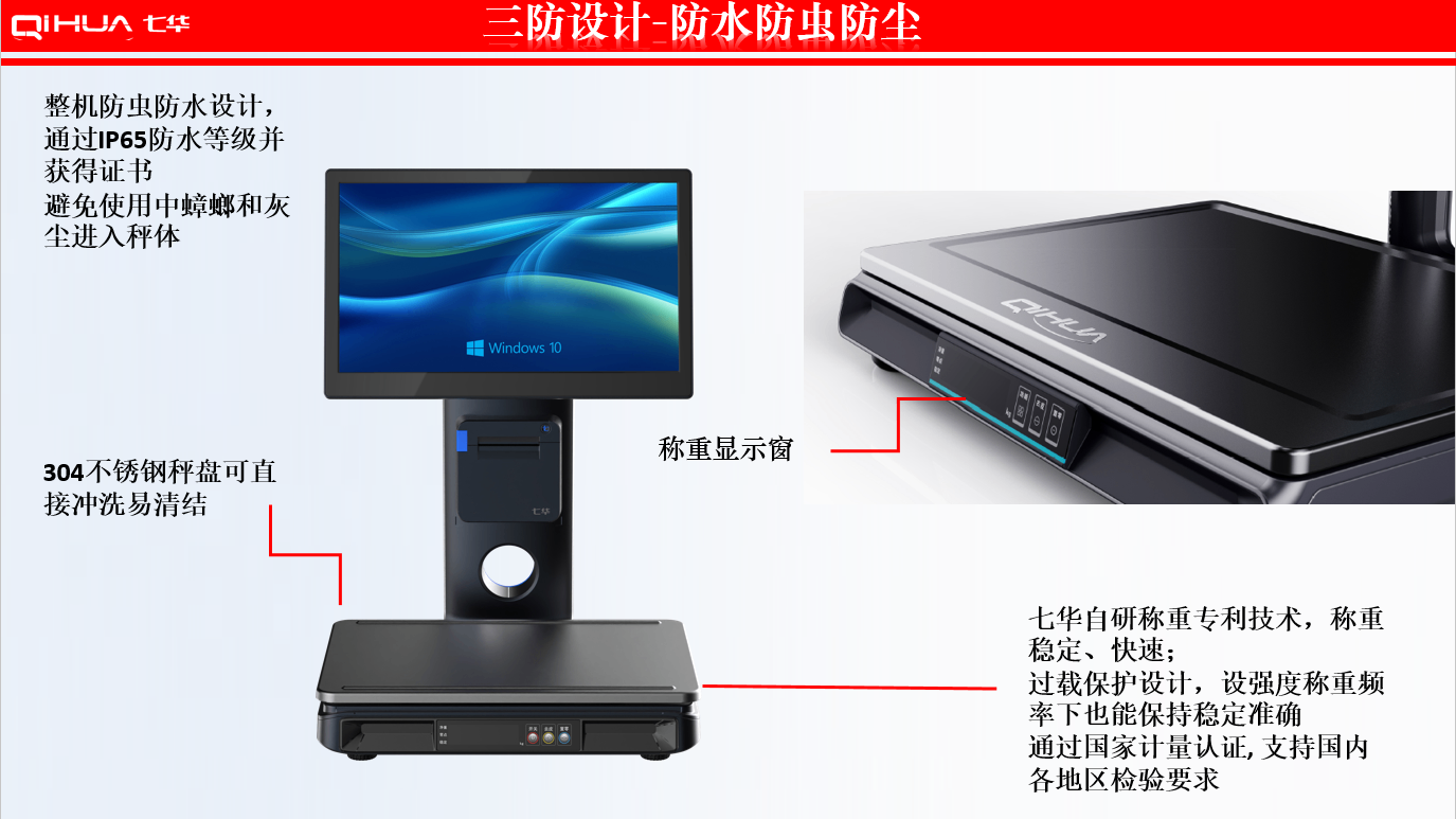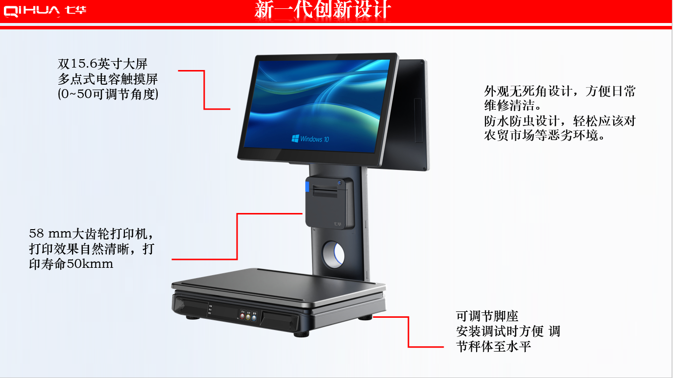 描述:新一代創(chuàng)新設(shè)計(jì),雙15.6英寸大屏,多點(diǎn)式電容觸摸屏可(0~50可調(diào)節(jié)角度)。鋁合金立桿,全新的線倉(cāng)設(shè)計(jì),輕松藏線,防止線材暴露雜亂。臺(tái)面整潔有序。七華自研稱(chēng)重專(zhuān)利技術(shù),稱(chēng)重穩(wěn)定、快速;過(guò)載保護(hù)設(shè)計(jì),設(shè)強(qiáng)度稱(chēng)重頻率下也能保持穩(wěn)定準(zhǔn)確;通過(guò)國(guó)家計(jì)量認(rèn)證, 支持國(guó)內(nèi)各地區(qū)檢驗(yàn)要求。外觀無(wú)死角設(shè)計(jì),方便日常維修清潔。 防水防蟲(chóng)設(shè)計(jì),輕松應(yīng)該對(duì)農(nóng)貿(mào)市場(chǎng)等惡劣環(huán)境。